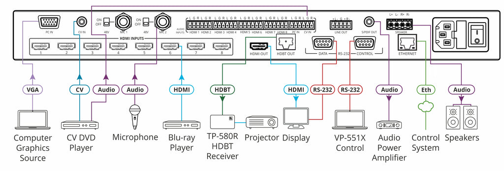 - Opciones de audio versátiles: — Incluye una entrada de audio analógica complementaria para cada una de las 10 entradas de video, lo que permite al usuario incrustar un canal de audio analógico separado en cada señal de video o evitar una entrada de audio incrustada (por ejemplo, para admitir formatos de audio comprimido multicanal como Dolby y DTS). Proporciona 2 entradas de micrófono independientes en conectores de 6,3 mm (cada uno con alimentación phantom opcional de 48 V) para mezclar, cambiar o hablar. En la salida, además del audio incrustado en las salidas HDMI y HDBaseT, la señal de audio también se extrae (se desintegra) y se emite como audio analógico estéreo balanceado y como audio digital a través de un dispositivo conectado S / PDIF, y se amplifica a 20W por canal para conexión a altavoces.