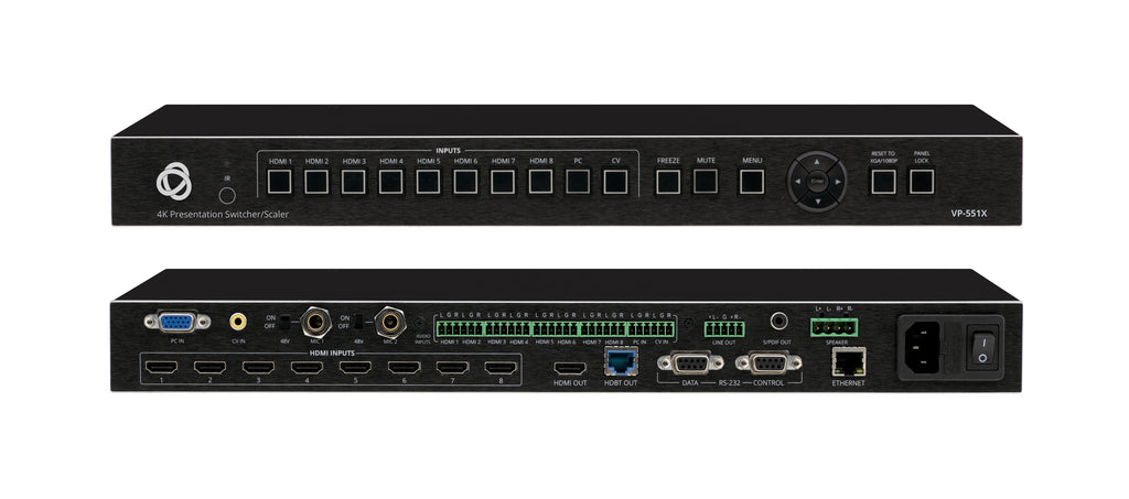 VP − 551X es un escalador / selector de presentación profesional y versátil para señales de video HDMI, VGA y compuesto de 4K @ 60 (4: 4: 4). La unidad escala el video y ofrece opciones para usar el audio HDMI incorporado o para seleccionar el canal de audio complementario de una de las diez señales de entrada de audio analógico. Después de procesar y escalar, la señal AV incorporada se envía a las salidas HDMI y HDBaseT simultáneamente, y el audio también se envía a una salida de audio estéreo balanceada, salida digital S / PDIF y un par de altavoces.