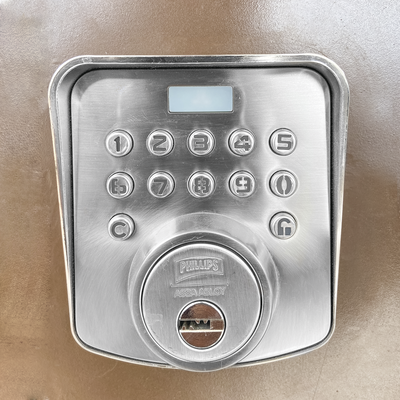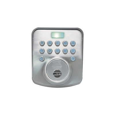 Cerradura reversible CTR Phillips, de sobreponer para uso en puertas o rejas de entrada principal, para interiores y exteriores, con tecnología digital y espesor de puerta de 38 a 50 mm en Niquel Satinado.