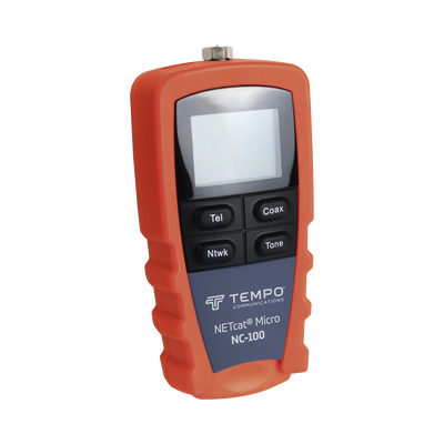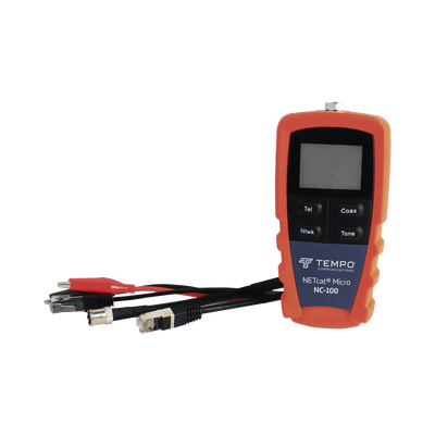 El probador de cableado NETcat® NC-100 es un dispositivo que verifica el par trenzado y los cables coaxiales. Utiliza tecnología digital de alta velocidad para verificar la continuidad del cableado y la asignación correcta de los pares de cables. Este equipo es compatible con cable de par trenzado blindado (STP), par trenzado no blindado (UTP) y cables coaxiales.