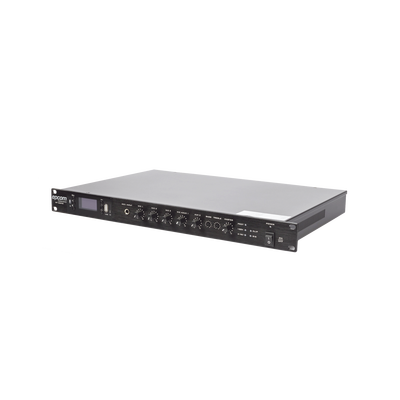 Mezclador / Amplificador de alta eficiencia para lugares donde se requiere reproducción de música de fondo simple, con un diseño compacto y sofisticado.