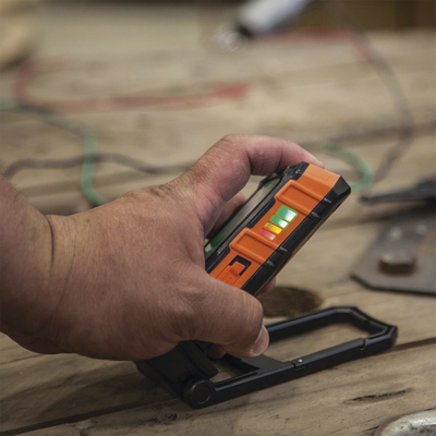 Pie de apoyo que cuenta con potentes imanes para fijarla, y los tres agujeros para clavo y el mosquetón incorporado facilitan colgarla.