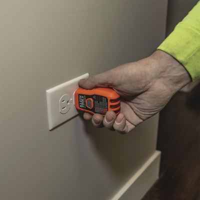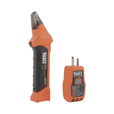 Probador GFCI que consta de dos piezas: un transmisor conectado al tomacorrientes o accesorio eléctrico, y un receptor que se usa para escanear el cortacircuitos correcto en el panel.