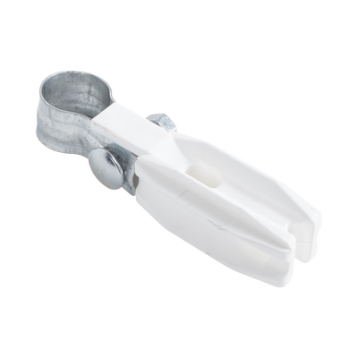 Aislador de paso o esquina con abrazadera de 1' diametro para uso en poste de cerca electrica.