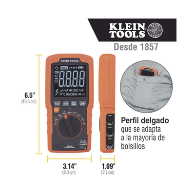- El perfil delgado permite que el multímetro se adapte de manera práctica a la mayoría de los bolsillos