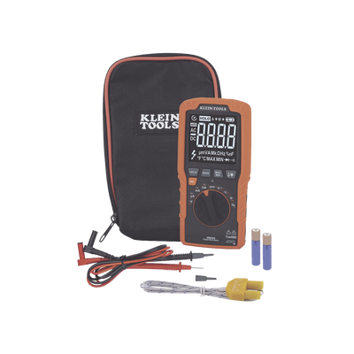 - Incluye una bolsa de transporte, cables de prueba con clasificación de seguridad CAT III 1000 V/CAT IV 600 V, termopar con adaptador y 2 baterías AAA