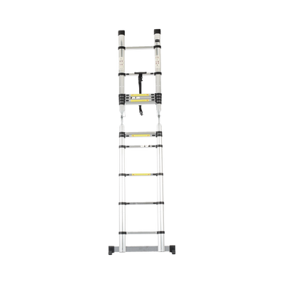 La escalera telescópica de aluminio tipo tijera PSTH10002, con una altura total de 1.9 + 1.9 metros, es la solución ideal para trabajos que requieren estabilidad y practicidad, su diseño plegable permite utilizarla en forma de tijera o desplegarla como una escalera recta, adaptándose a diversas necesidades.