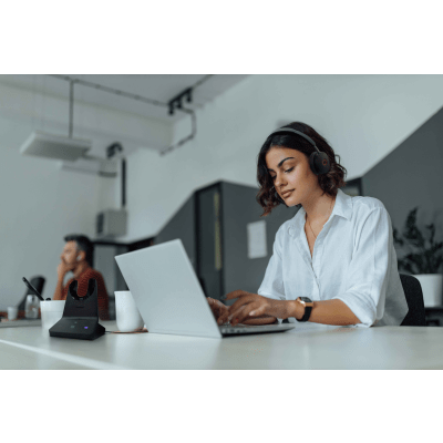 Ideal para centros de contacto, oficinas abiertas y espacios de trabajo colaborativos donde se requiere movilidad y cancelación de ruido avanzada