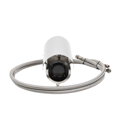 Características del Gabinete. -Fabricado en capa dual de acero inoxidable. -Soporta IP68 para intemperie. -Bracket semi-fijo y 2 mangueras Incluidos. -2 Entradas de 10 mm de diámetro para cableado. -Válvulas de Entrada/Salida de agua G1/4'. -Diámetro del vidrio frontal de 65 mm. -Dimensiones ext. 300 x 134 x 151 mm. -Dimensiones int. Diámetro 100 mm, Largo 280 mm. -Temperatura de operación 0º a 250ºC. Peso 4 kg. -Alimentación incluida 110 Vca. a 12 Vcc para cámara.