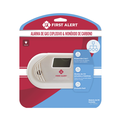 La alarma combinada de gases explosivos y monóxido de carbono de First Alert GCO1CN con respaldo de batería cuenta con una pantalla digital retroiluminada y detecta gas metano (natural), gas propano (LP) y monoxido de carbono (CO). Este detector de gas explosivo y CO se conecta a cualquier tomacorriente del sistema electrico sin necesidad de hardware de montaje adicional.