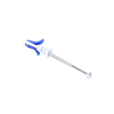Taquete tipo mariposa, con tornillo integrado para fijar y sujetar objetos en muros falsos como tablaroca, mampostería y tabique hueco,